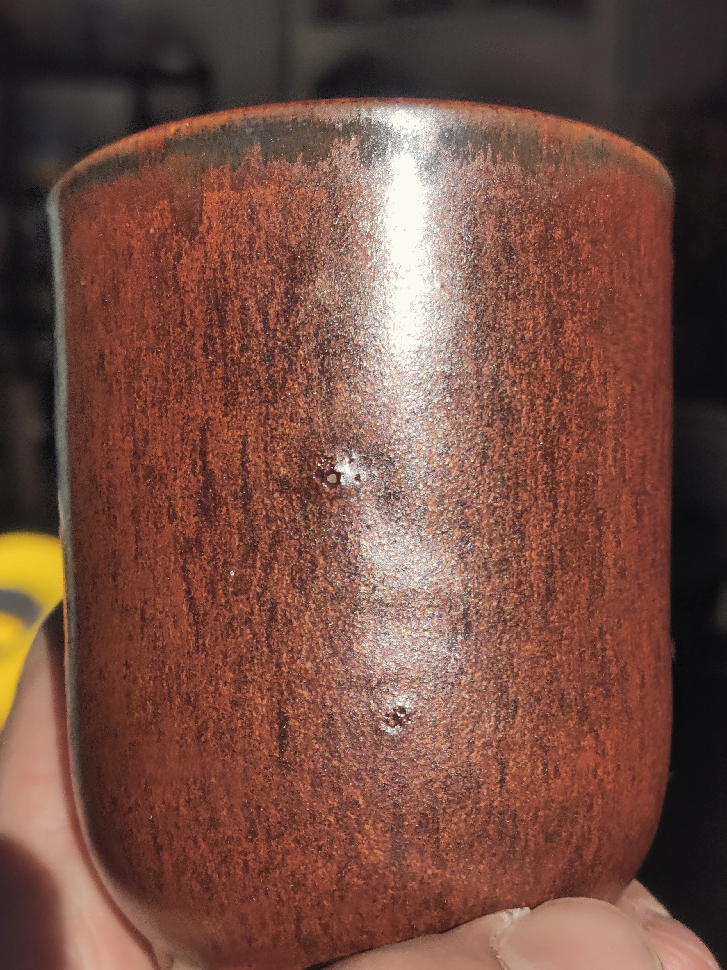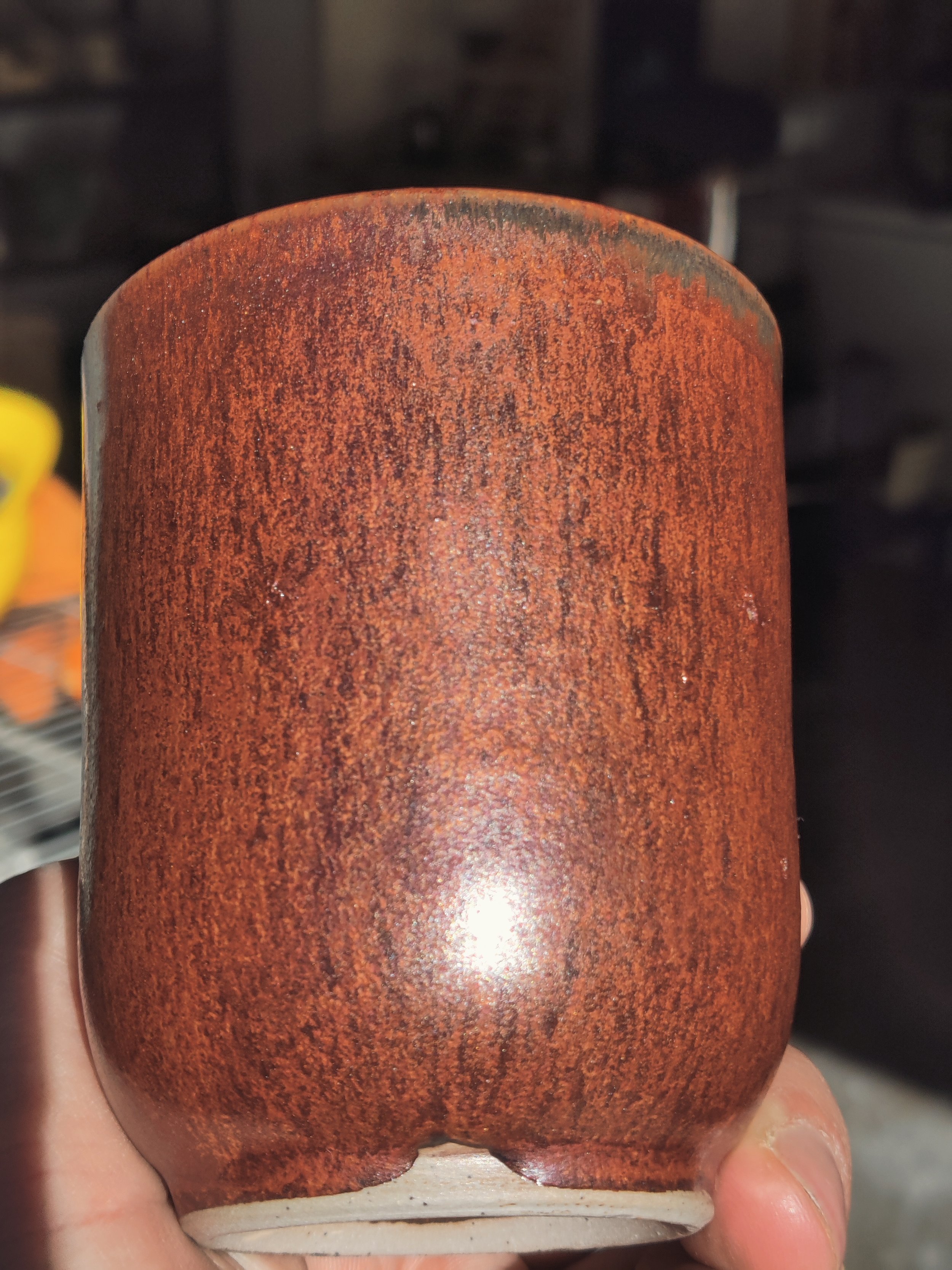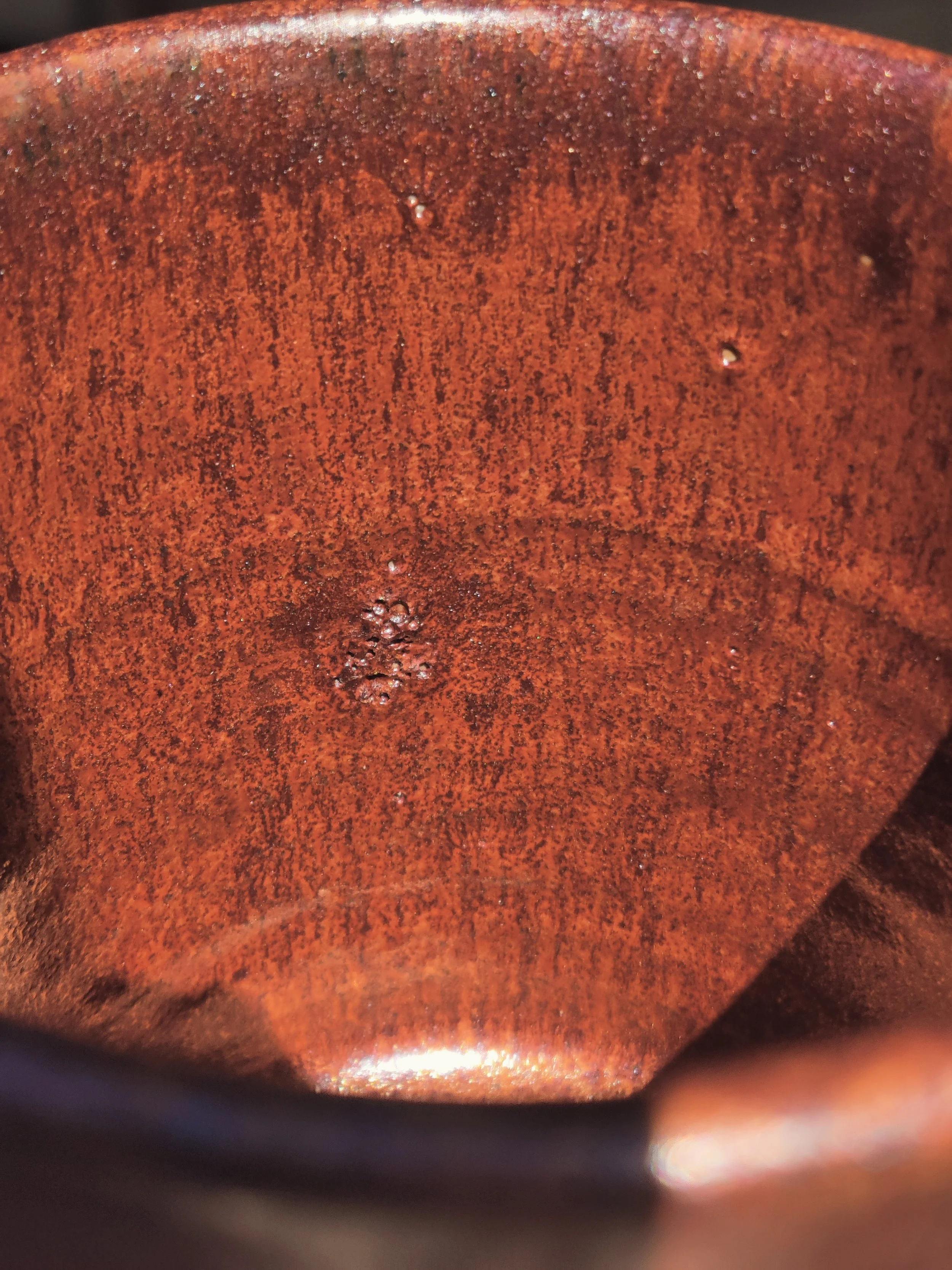 This is normal red lotus at cone 6 ox. Notice the MICRO crystals. Yes, I said micro. This goes along with my theory that Kaki red cone 6 ox glazes are really just crystal glazes.
