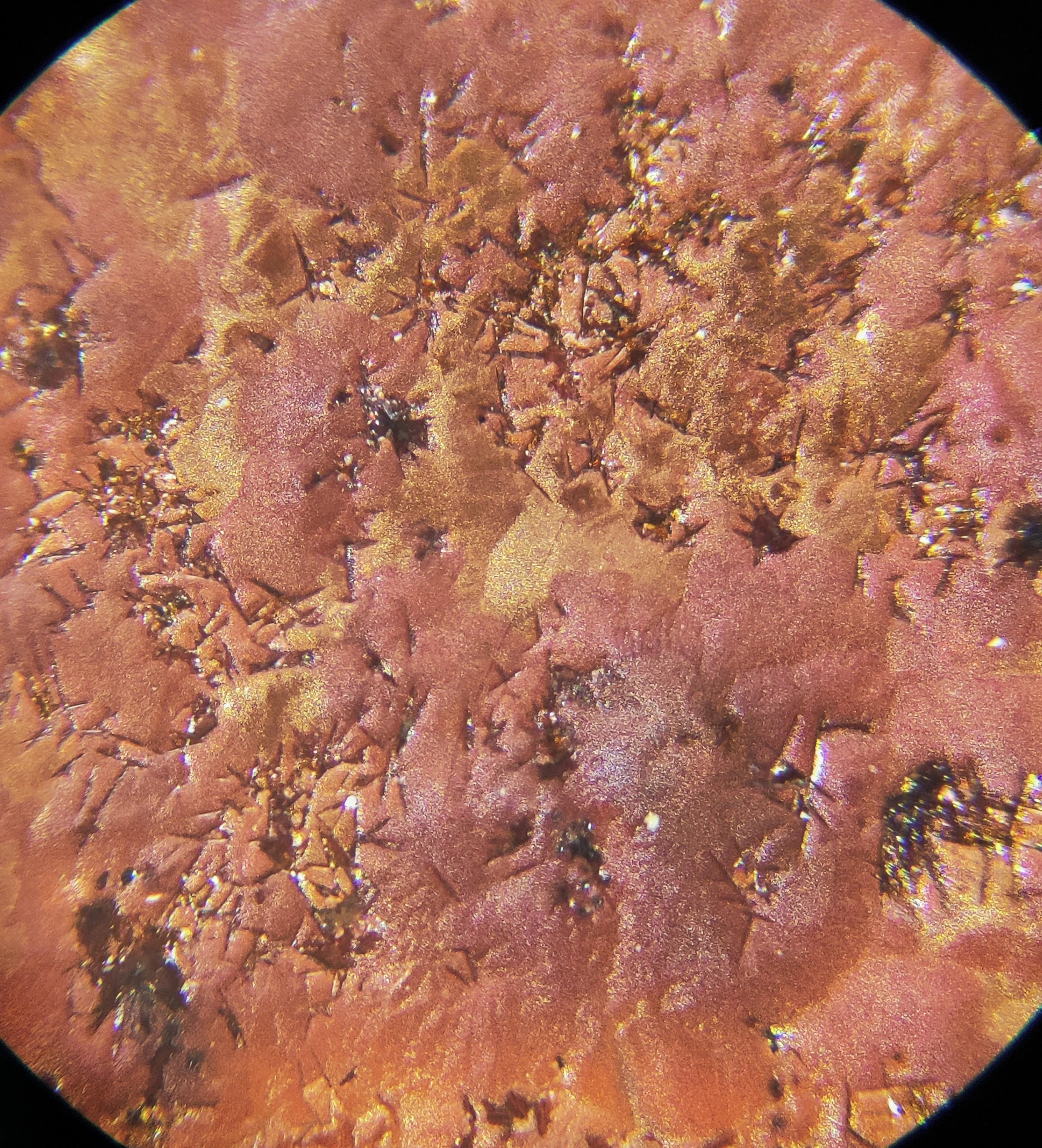 I have recently bought a very cheap microscope; Just to play with. Of course the first thing I did is put some of my test tiles underneath it to see if I could identify anything in the glaze. For example, Make a glaze on a tile, add something to it ( In this case bismuth) and see if you can identify it just by looking at it. Turns out you can. Here is a picture of one of my red glazes without and with bismuth.